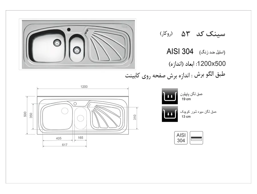 عمق لگن بزرگ 19 سانتیمتر ,عمق لگن کوچک 13 سانتیمتر ,دارای سیفون و زیرآب |